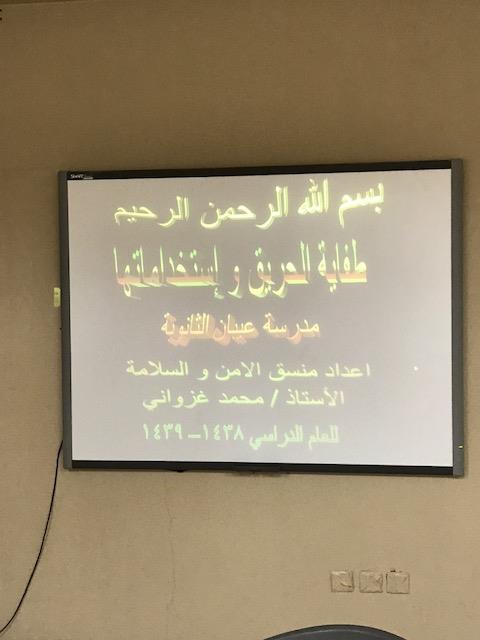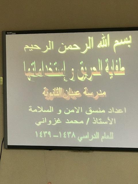 نفذت ثانوية عيبان دورة عن طريقة التعامل مع طفاية الحريق وطريقة الإخلاء في حالة حدوث مكروه لاسمح الله , وقد نفذ الدورة منسق الأمن والسلامة في المدرسة الأستاذ محمد حيان الغزواني. وقد حضر الدورة قائد المدرسة الأستاذ عيسى الفيفي ومعلمين وطلاب المدرسة .
